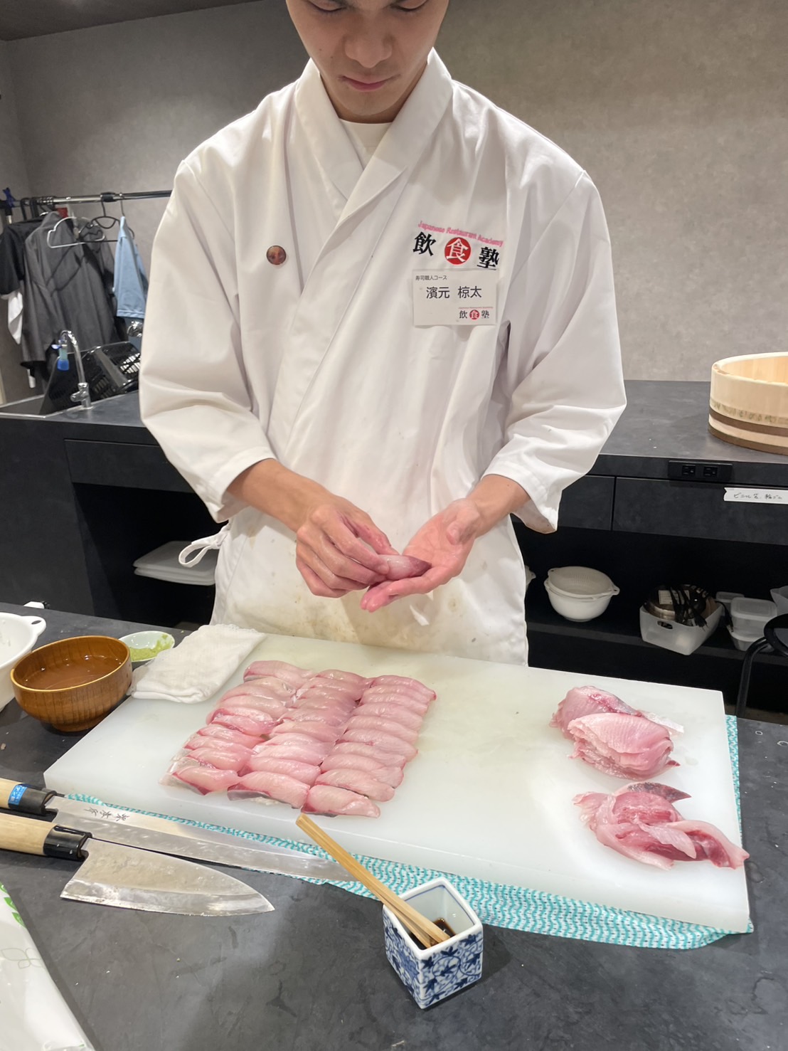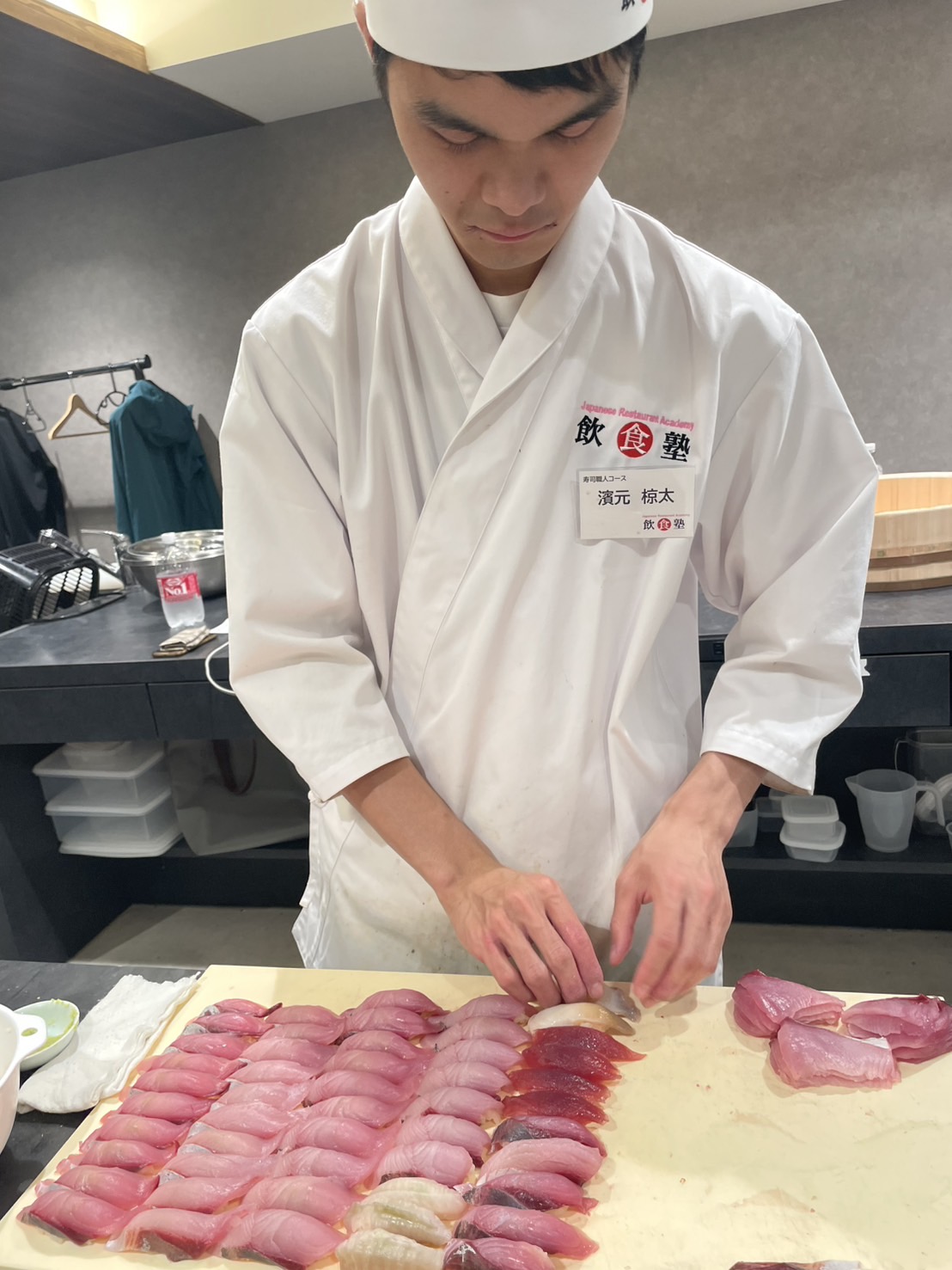 寿司学校「飲食塾」の授業34日目。お刺身の基本と握りの練習を通じて、スキルアップを目指します。