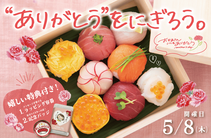 ・プレゼント用なので、プロにお寿司の作り方を教えてもらいたい!そんなご要望にお応えして、少し早い母の日のプレゼントにもできるよう、イベントは5月8日に実施します。