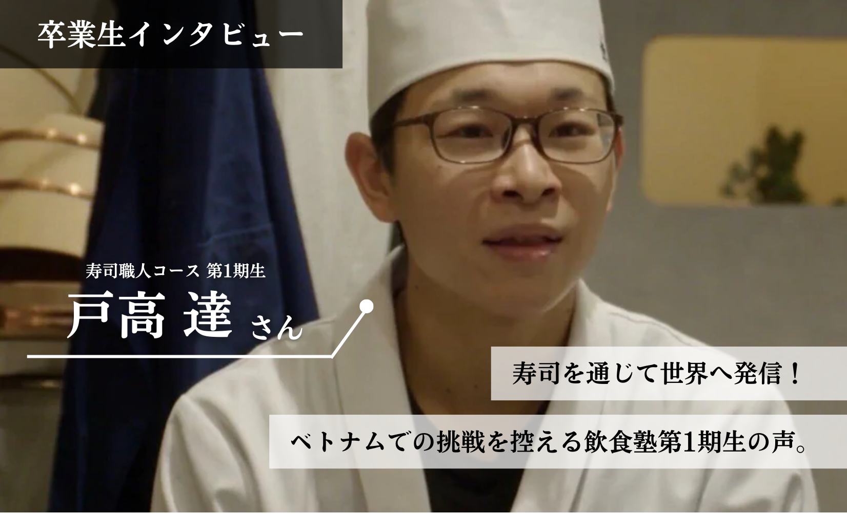 飲食塾第1期生・戸高達さん(2022年12月卒業)のインタビュー。料理技術に加え、所作や考え方、マーケティングまで総合的に学んだ3カ月間を振り返り、ベトナムで寿司を通じて日本食文化を発信していく決意を語ります。仕事と学びを両立しながら挑戦した戸高さんの成長と、今後の夢をご紹介します。