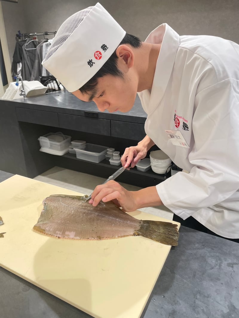 本日の授業では、ヒラメとカンパチという二種類の白身魚を題材に、皮引きや握りの実践を行いました。