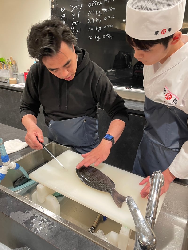 津本式といえば、魚の鮮度を保つための「究極の血抜き」として知られていますよね。今日はその理論と技術を、少人数制のクラスでじっくり学びました。生徒たちも真剣そのもので、こうした丁寧な授業ができるのも、少人数ならではの良さだなあと感じます。