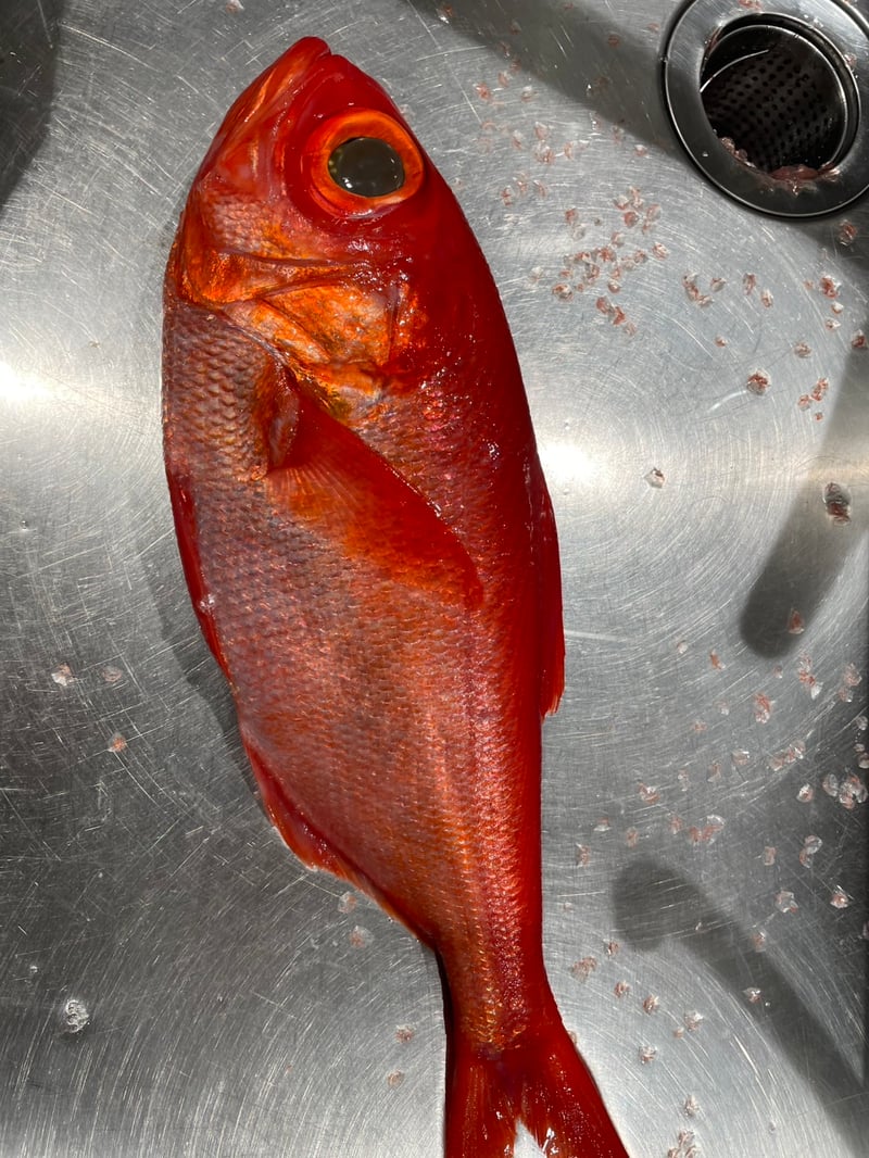 金目鯛は、見た目は華やかですが、意外と扱いが難しい魚です。身が柔らかく、中骨が短めな分、三枚おろしの際に骨を感じにくいという特徴があります。