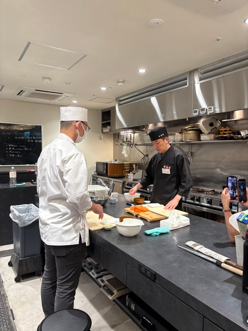 お米の洗い方、水加減、そして土鍋やガス釜を使った炊き方を丁寧に説明していきました。座学だけでなく、合わせ酢の作り方やシャリの切り方も見本を見せながらじっくりと。