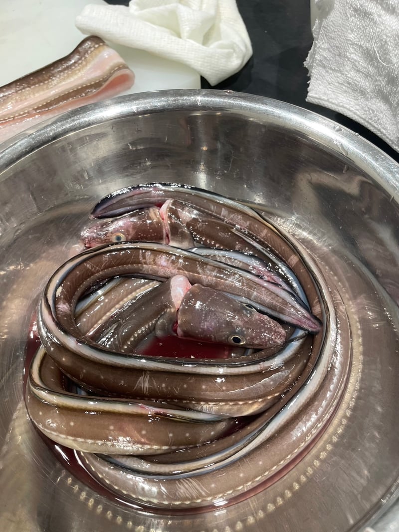 朝は8:30に授業準備をし、9時にはシャリを炊きました。その後、来週のランチ営業に向けて、キンメダイと穴子の仕込みです。