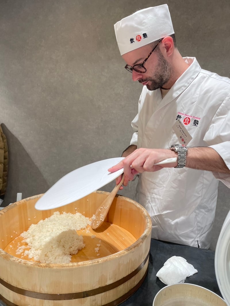 少人数のクラスなので、生徒一人ひとりの手元を見ながら進められるのがこの寿司学校の良いところ。少しずつですが、みんな手の動きが良くなってきました。