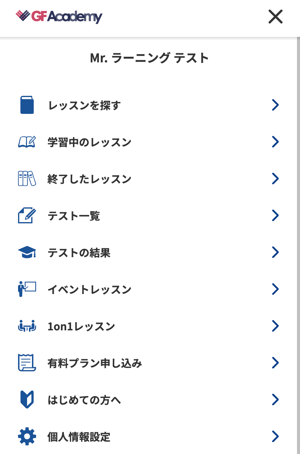 過去に受講した、または現在受講途中のレッスンを確認するには、GF Academyのトップページから選択します。