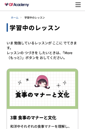 - 途中から再開: レッスン項目をタップし、内容やテストの途中で離脱した場合は「More(もっと)」ボタンを押すことで、未完了の部分が表示されます。