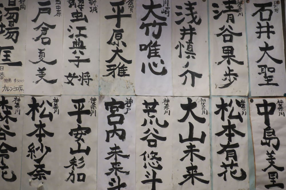 食事の途中に店の奥の壁に筆文字で名前が書かれた半紙がたくさん並べてあるのを見つけて、これは何かと従業員に尋ねたところ、「店の全従業員の名前」ということだった。女将、店長からアルバイトまでこの店に従事する人たちの名前を掲出することで、モチベーションがとても高まるという。