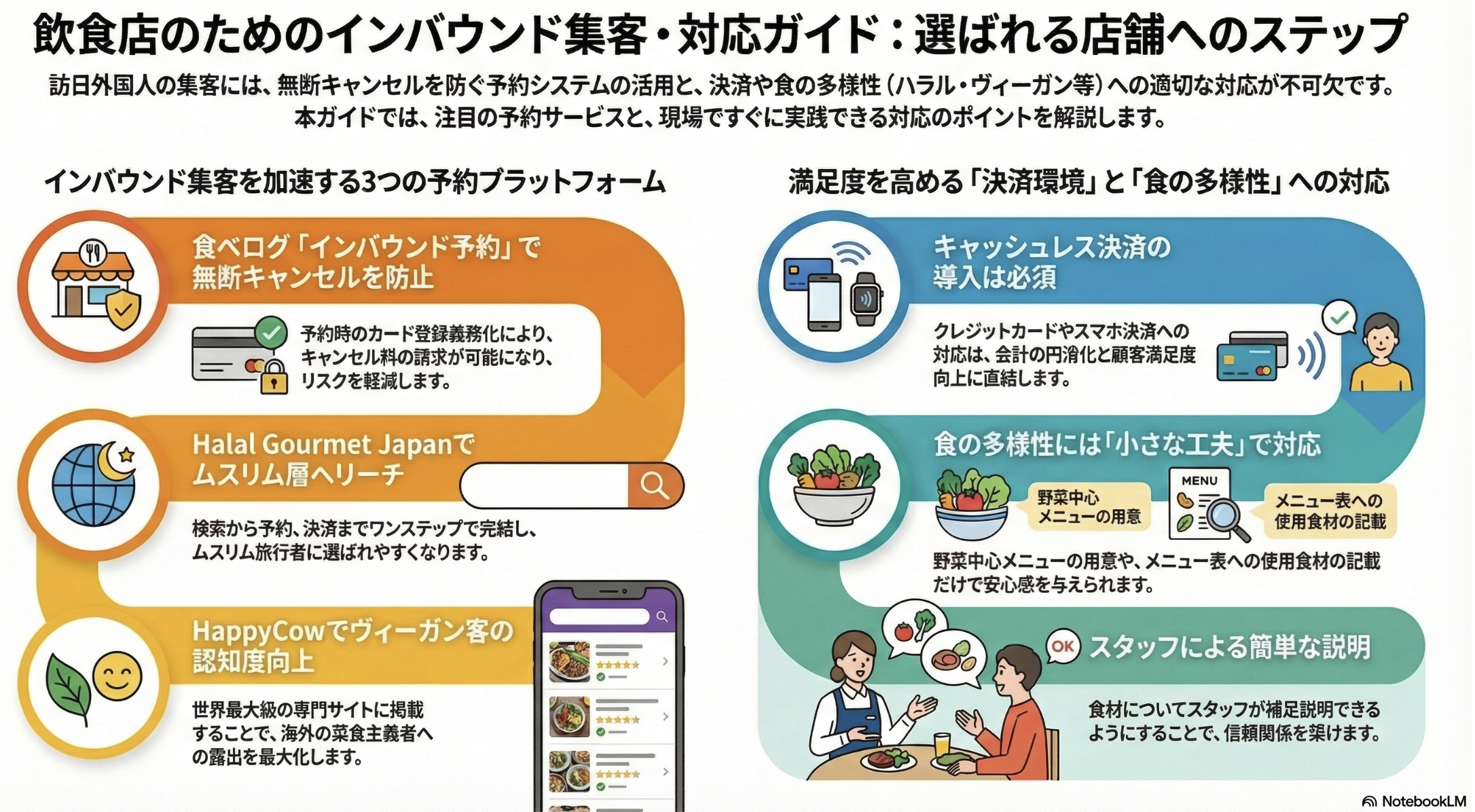 訪日外国人に対応するうえで、予約システムと同じくらい重要なのが「決済方法」と「食の多様性」への対応です。