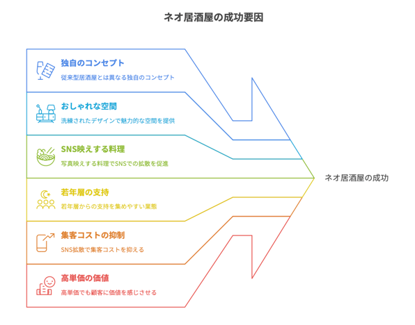 これらの事例からわかるように、ネオ居酒屋の成功には、「顧客のニーズを捉えたコンセプト設定」「差別化された商品・サービスの提供」「効果的なマーケティング戦略」が重要です。