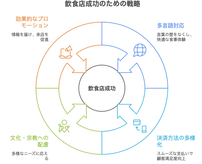 訪日客増加の波に乗り、売上を伸ばすためには、訪日客のニーズを捉えた戦略が不可欠です。以下に、飲食店成功のための5つの戦略を紹介します。