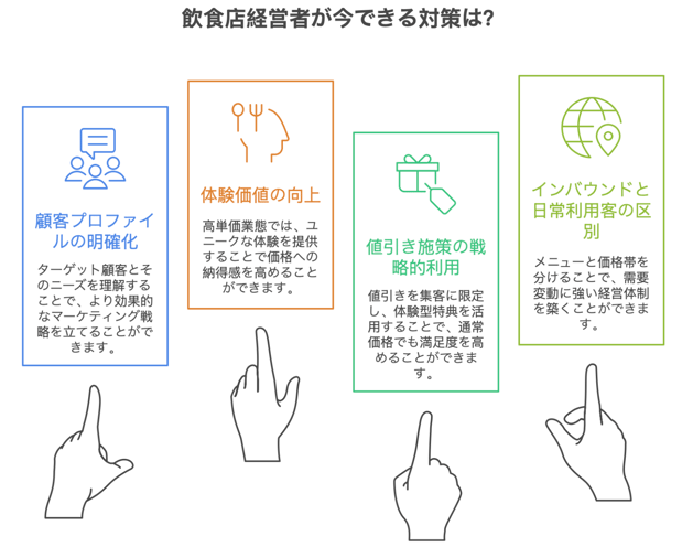 これからの飲食店経営では、価格や割引、インバウンドといった単一要素に依存せず、「どんな人が、どんな場面で、なぜこの店を選ぶのか」を明確に設計することが重要です。高単価業態では利用シーンや体験価値を言語化し、コースやセットを通じて価格への納得感を高めることが求められます。値引き施策は集客目的に限定し、体験型特典などを活用して通常価格でも満足度の高い構成を整えることが不可欠です。また、インバウンドは“売上の柱”ではなく“上積み”と捉え、観光客向けと日常利用客向けでメニューや価格帯を分けることで、需要変動に強い経営体制を築くことができます。