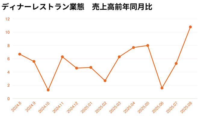 ディナーレストラン業態は110.8%と堅調。お盆・夏休みシーズンを通じて家族・団体利用が伸び、大阪・関西万博関連の観光需要も一部で追い風となった。
