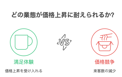 喫茶や和風レストランのように、空間や接客を含めた“満足体験”を提供し、価格上昇を「価値の向上」として受け入れてもらえる業態がある一方で、居酒屋やテイクアウト中心の業態では価格競争が激しく、値上げが来客数の減少につながりやすい傾向がある。