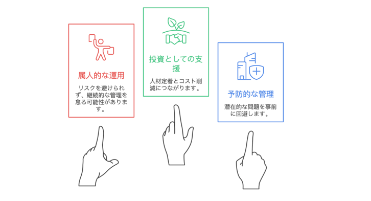 入管庁からの指導や在留資格の取消は、単なる行政手続きの問題にとどまりません。特定技能外国人が働けなくなれば、現場の人手不足は一気に深刻化します。また、将来的に外国人採用そのものが難しくなる可能性もあります。