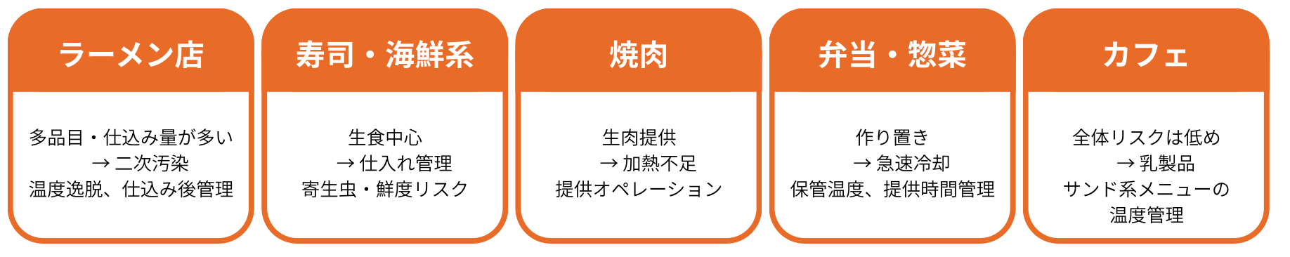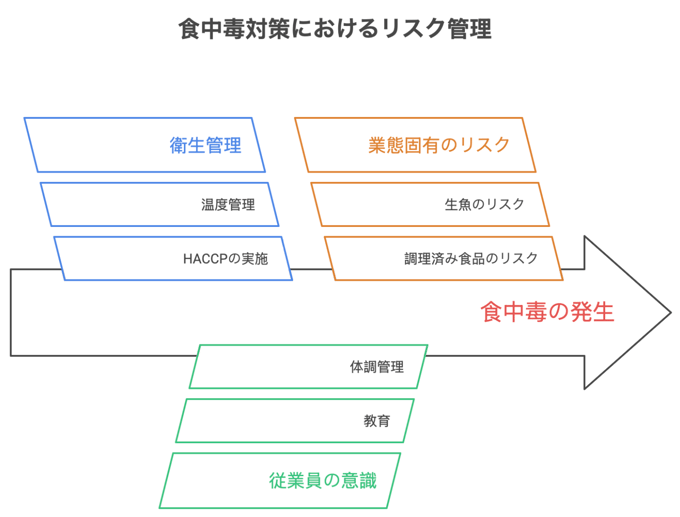 これは「衛生意識が低い店だけが起こしている問題」ではなく、業態構造そのものが内包するリスクとも言えます。そして「どの業態か」によって、注意すべきリスクの種類と優先順位は明確に異なります。