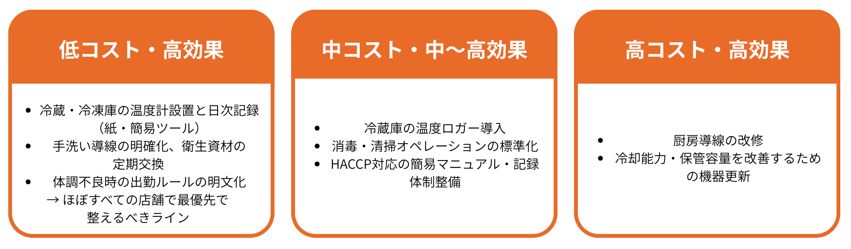 食中毒対策への投資は、「完璧を目指す」ものではなく、「事故が起きた場合の損失を現実的に回避する」ためのものと考えるべきです。営業停止、行政指導、風評被害、損害賠償といったリスクを考えると、最低限の設備投資と運用体制の整備は、コストではなく保険に近い位置づけになります。