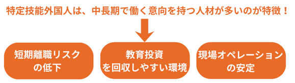 一方、特定技能外国人は、就労を主目的として来日しているケースが多く、中長期で働く意向を持つ人材が多いのが特徴です。