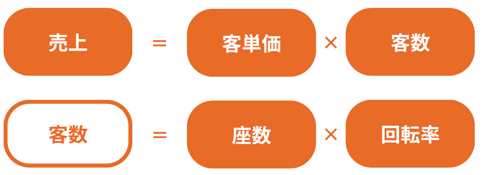 売上 = 客単価 × 客数。そして客数は、客数 = 席数 × 回転率です。