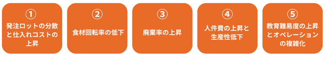 - ・人件費率の上昇:仕込みや調理の手間が増え、スタッフの効率が下がる