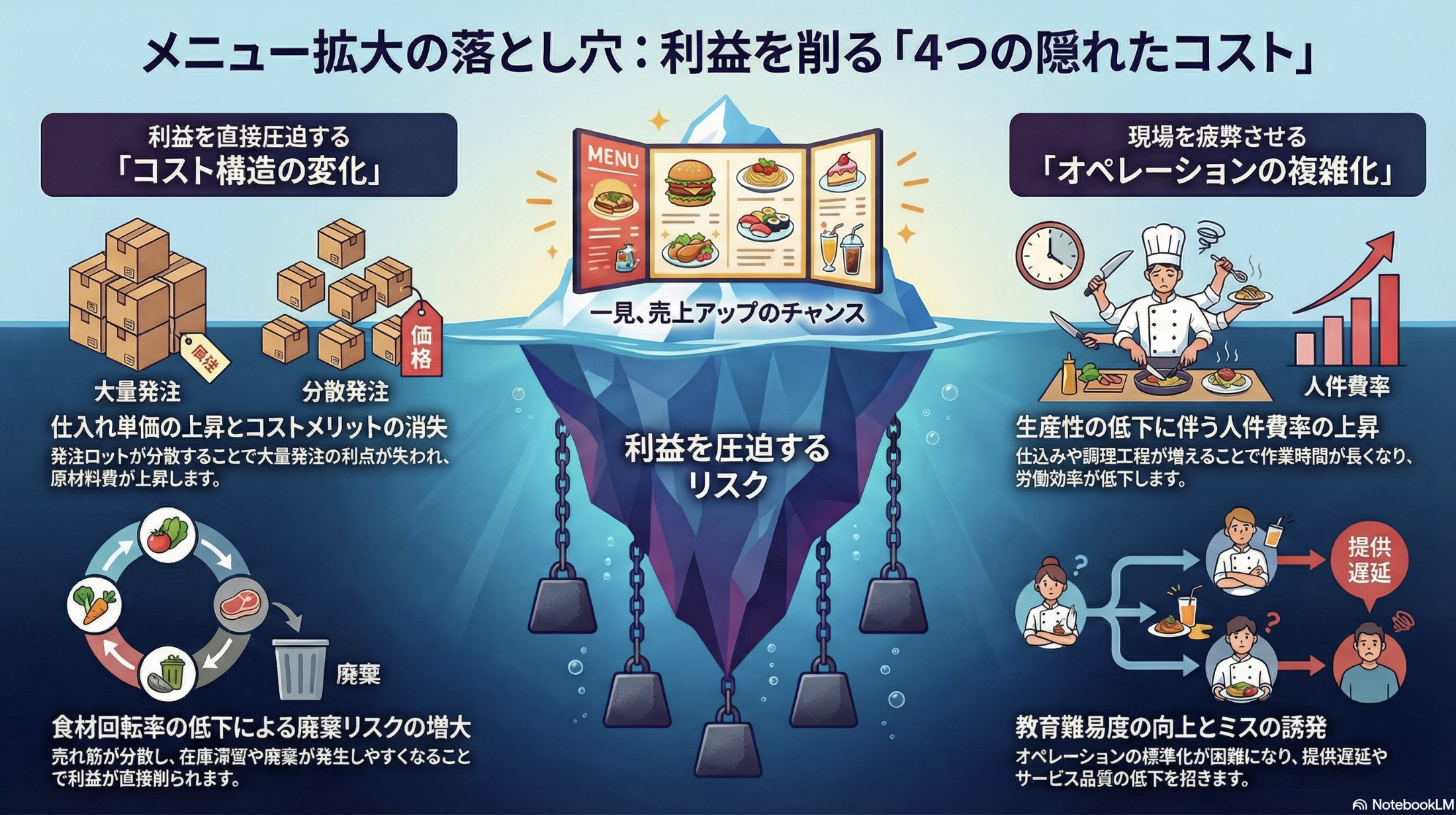 メニューが増えると、同じ食材をまとめて仕入れにくくなり、大量発注によるコストメリットが失われます。結果として、仕入れ単価が自然に上がります。 - ・食材回転率の低下 → 廃棄リスクの増大