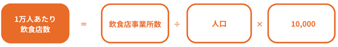 この式の意味を、言葉で分解してみましょう。まず「飲食店事業所数 ÷ 人口」を行うと、人口1人あたり何店舗あるかが出ます。