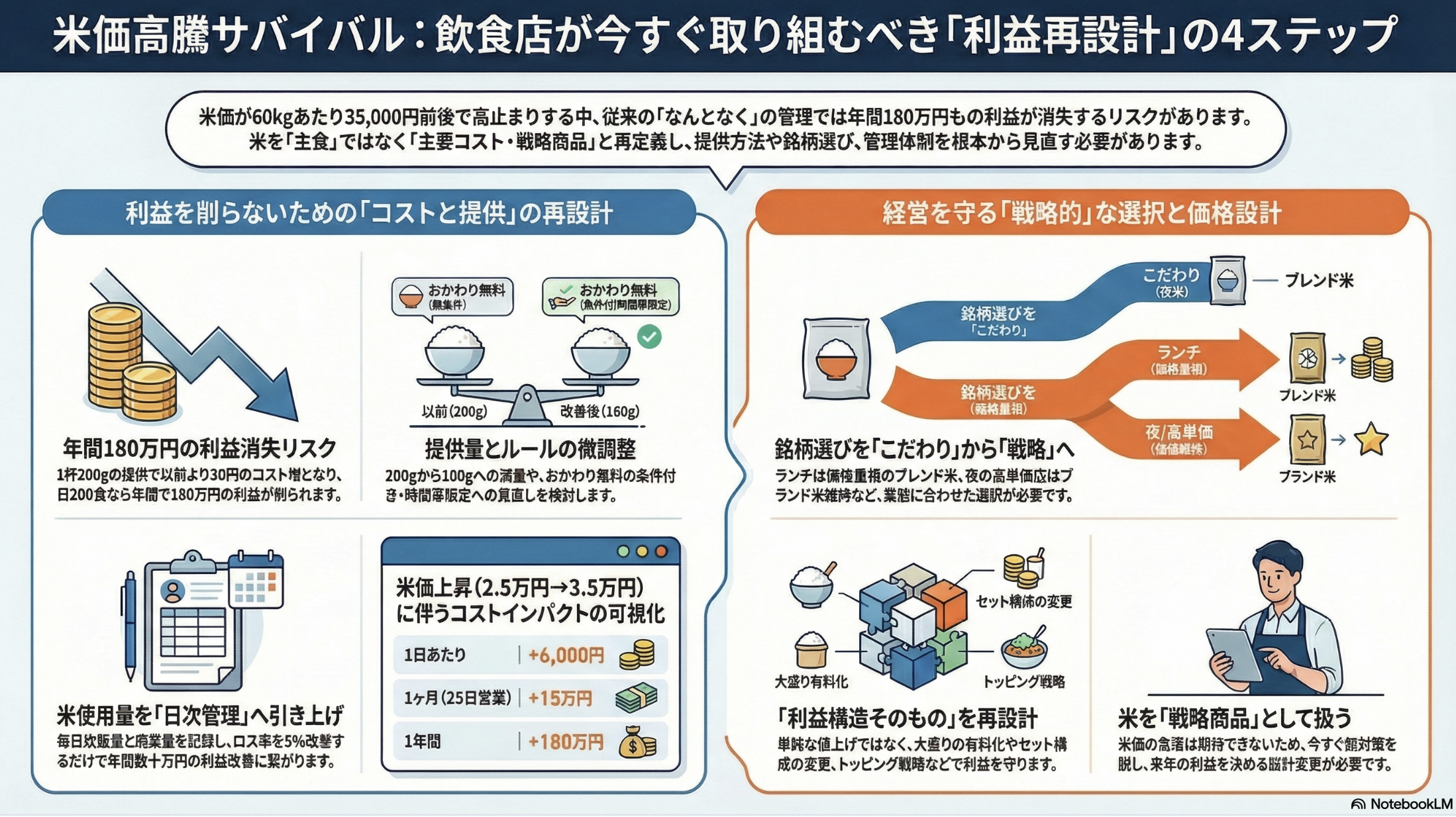 米価格は元に戻るかどうかを待つ段階ではありません。この価格帯を前提に、どう利益を守るかを考える段階に入っています。飲食店経営は今、受け身ではなく再設計のフェーズです。