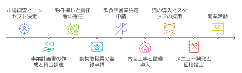 猫カフェ開業までの大まかな流れは以下の通りです。
