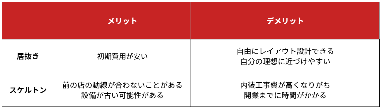 何もない「空っぽ」の状態からスタートする物件のこと。ゼロから自由に内装や設備を作れるので、自分の理想のお店を形にしやすいです。ただし、内装工事にお金と時間がかかります。
